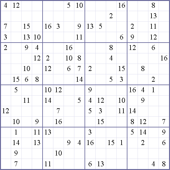 Home - How To Play Play Sudoku - Easy: 9x9 16x16 Medium: 9x9 16x16 Hard: 9x9 16x16 Crazy: 9x9 16x16 Get Last Week's Answers - Easy: 9x9 16x16 Medium: 9x9 16x16 Hard: 9x9 16x16 Crazy: 9x9 16x16